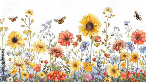 Vibrant garden panorama with a variety of blooming flowers and busy bees