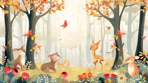 Whimsical watercolor forest scene with baby animals and mushrooms on the forest floor