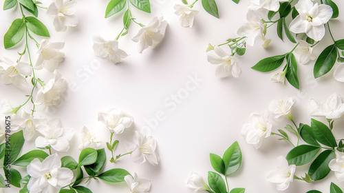 White jasmine flowers with green leaves on a white background in a minimalist composition