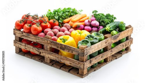Fresh colorful vegetables in a wooden crate isolated on white background