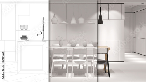 Weiße Wohnküche mit Esstisch