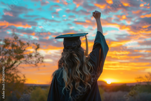 College graduate celebrates victory with raised arm against a vibrant sunset sky