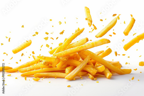 Crispy french fries flying in mid-air with crumbs isolated on white background