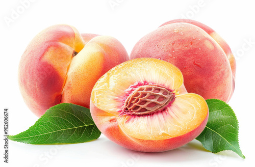 Fresh ripe peaches and a juicy slice on a white background
