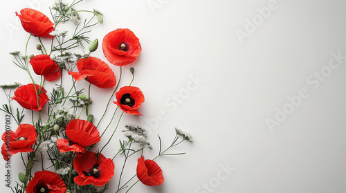 Red poppies flowers on left side on a white background creating vibrant contrast