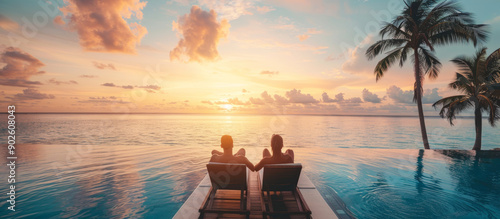 Two people relaxing on sun loungers at the poolside overlooking a stunning ocean sunset