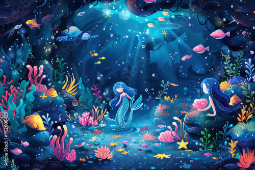 Whimsical underwater scene with playful mermaids, vibrant coral, and tropical fish