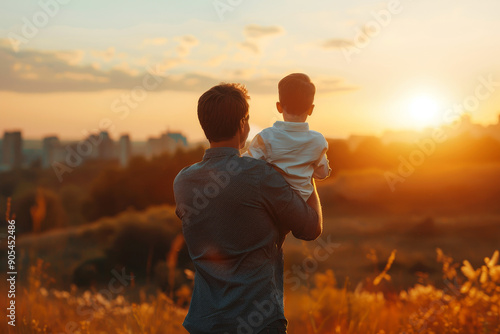Father and son standing in an open field at sunset, enjoying the view of the city in the distance