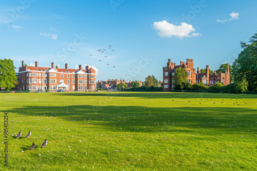 Panoramic view of English Campus with historic buildings and lush green lawn