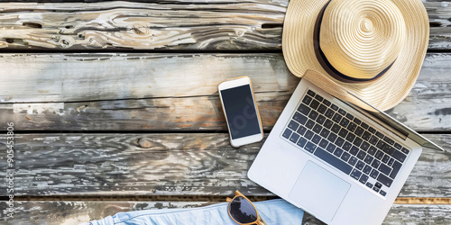 Top view of summer beach vacation essentials with laptop, smartphone, hat, and sunglasses on wooden deck