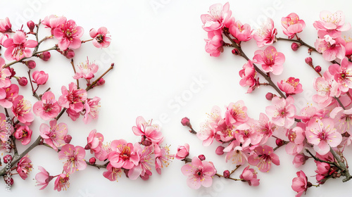 Vibrant pink cherry blossoms on a tree branch against a white background