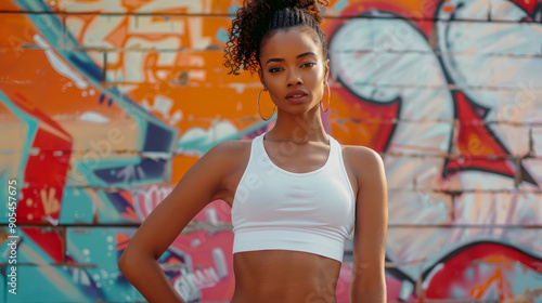 Fashionable black woman with curly hair posing against vibrant graffiti