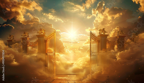 Golden door of heaven with illuminated stairs and glowing clouds in a serene, ethereal atmosphere