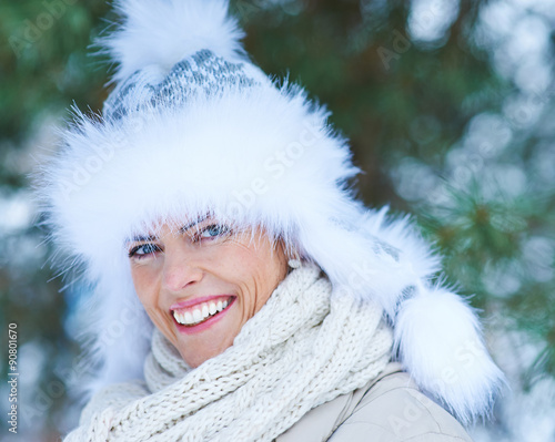 Smiling baby in winter clothes seated by snow-covered pine tree