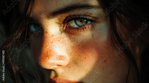 Close-up portrait of a woman showcasing her green eye with freckles and perfect eyelashes