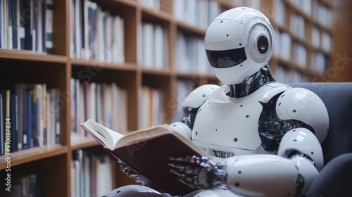 AI robot reading a book in a library, acquiring knowledge and skills from literature