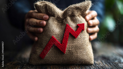 Businessman holding a dollar bag and a red arrow symbolizing growth and profit increase