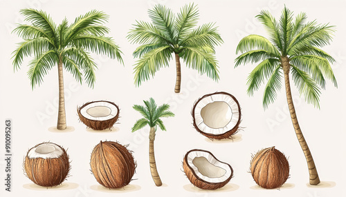 Frontal view of two Phoenix dactylifera date palm trees showcasing the lush green fronds against a pristine white background.