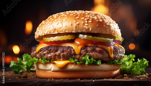 Delicious cheeseburger with fresh lettuce, tomato, and melted cheese on a sesame seed bun