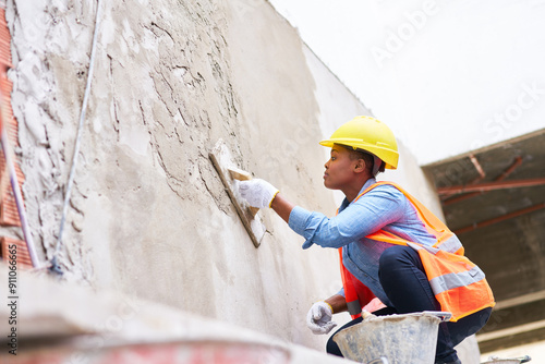 Low angle view of young female labor plastering on wall with cement while crouching at construction site