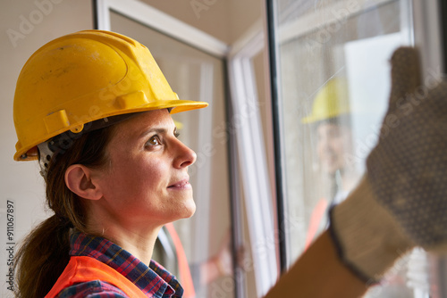 Female and male carpenters wearing safety workwear installing window frame in house construction site together