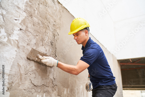 Young female bricklayer plastering wall with cement using trowel at construction site
