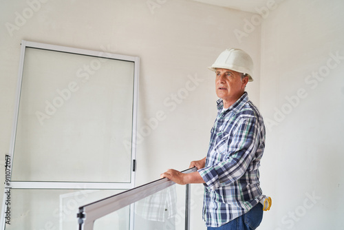 Side view of senior male supervisor standing with window frame at incomplete house site