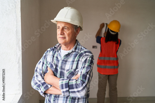 Thoughtful senior male supervisor wearing hardhat while standing with arms crossed against female coworker in background