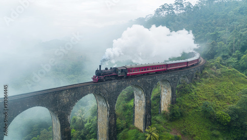 Old steam train crossing a stone viaduct in a misty forest landscape