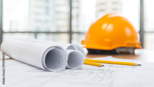 Close-up of blueprints with pencils and construction hard hat on desk in modern office