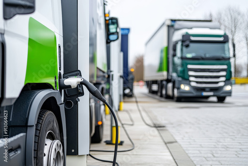 Close-up of an electric truck charging at a biogas station with another electric truck in the background