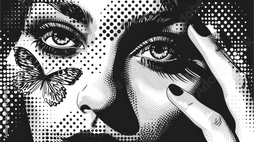 Creative stippled collage with eyes and floral elements in monochrome artwork expressing imagination and artistic innovation