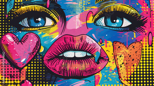 Vibrant pop art face with detailed eyes and lips surrounded by colorful hearts and halftone patterns