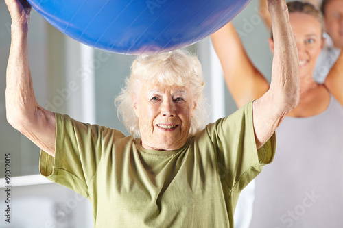 Glückliche Senior Frau mit Ball in der Ergotherapie