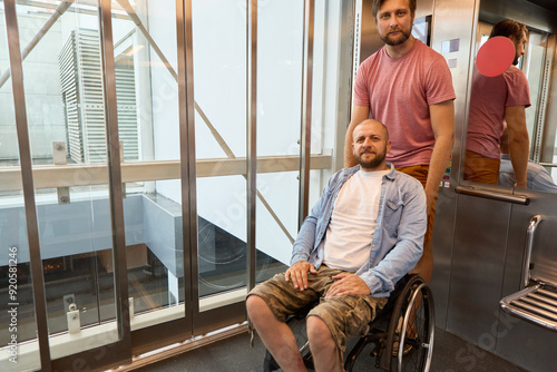 Person in a wheelchair accompanied by a friend in a modern building