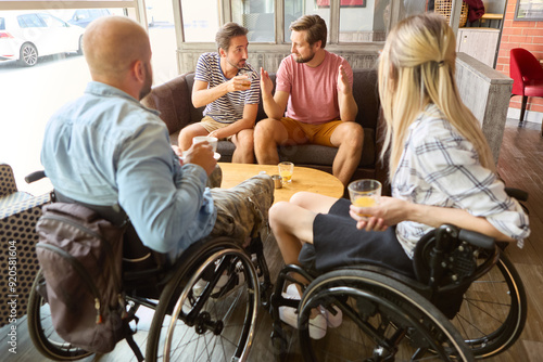 Group of friends enjoying conversation at a cafe, including people using wheelchairs