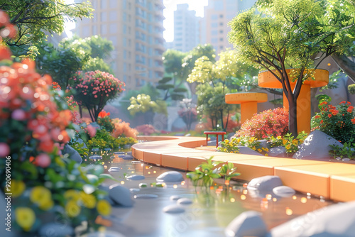 3D render of a vibrant city park with lush greenery and colorful flowers