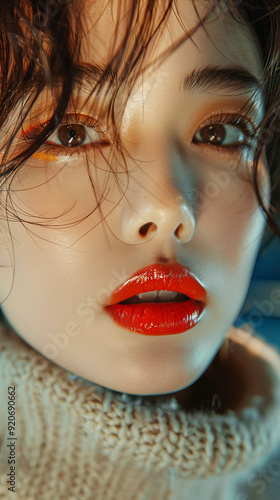 Close-up shot of a Chinese female fashion model with vibrant makeup and red lips