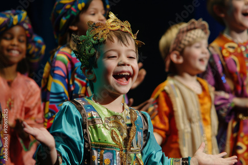 Children performing in a community theater production with joyful expressions and outstretched hands