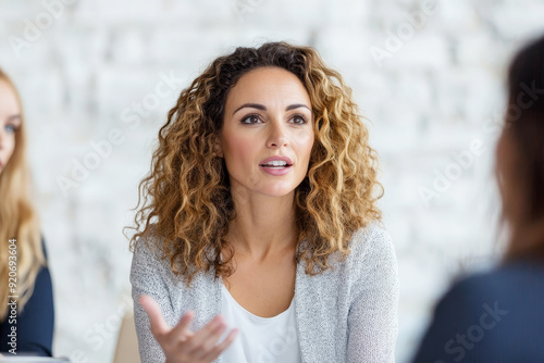 Diverse team brainstorming with a woman raising a question in a business meeting