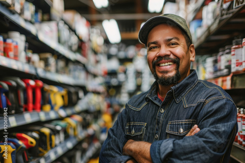 Smiling and happy hardware store worker standing in a store aisle