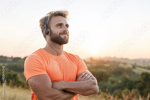 Happy tired athlete wearing earphones looking at landscape, enjoying sunset