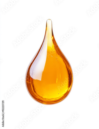 High definition image of a single drop of yellow oil against a clean white background, showcasing purity and essence in a minimalistic style