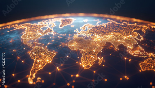 A global map of the world with glowing connections symbolizing international communication and technology networks across continents on a dark background