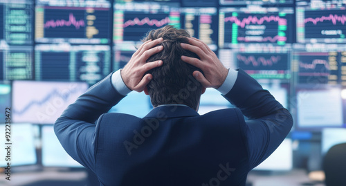 A lone stock trader in a suit anxiously observes volatile market trends on multiple screens with hands on his head, reflecting stress and pressure in a fast-paced environment.
