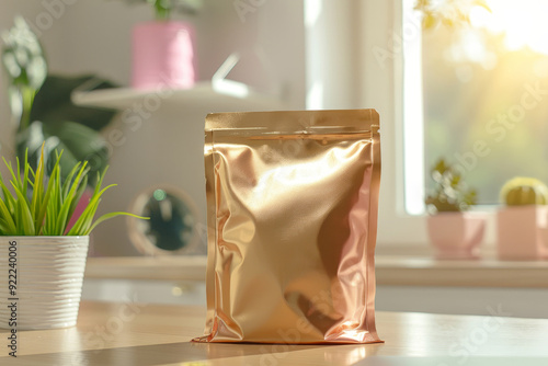 Blank gold pouch on a desk in bright room with plants and decorative items