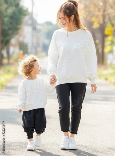 Loving Asian mother and child enjoy a peaceful walk in the park wearing matching casual outfits and shoes