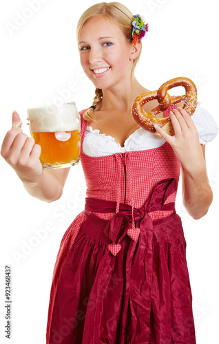 Bayrische Frau im Dirndl mit Bier und Brezel
