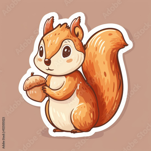 Cute squirrel holding acorn hand drawn sticker with white contour