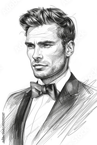 Minimalist pen drawing portrait of a man wearing formal attire with a bow tie